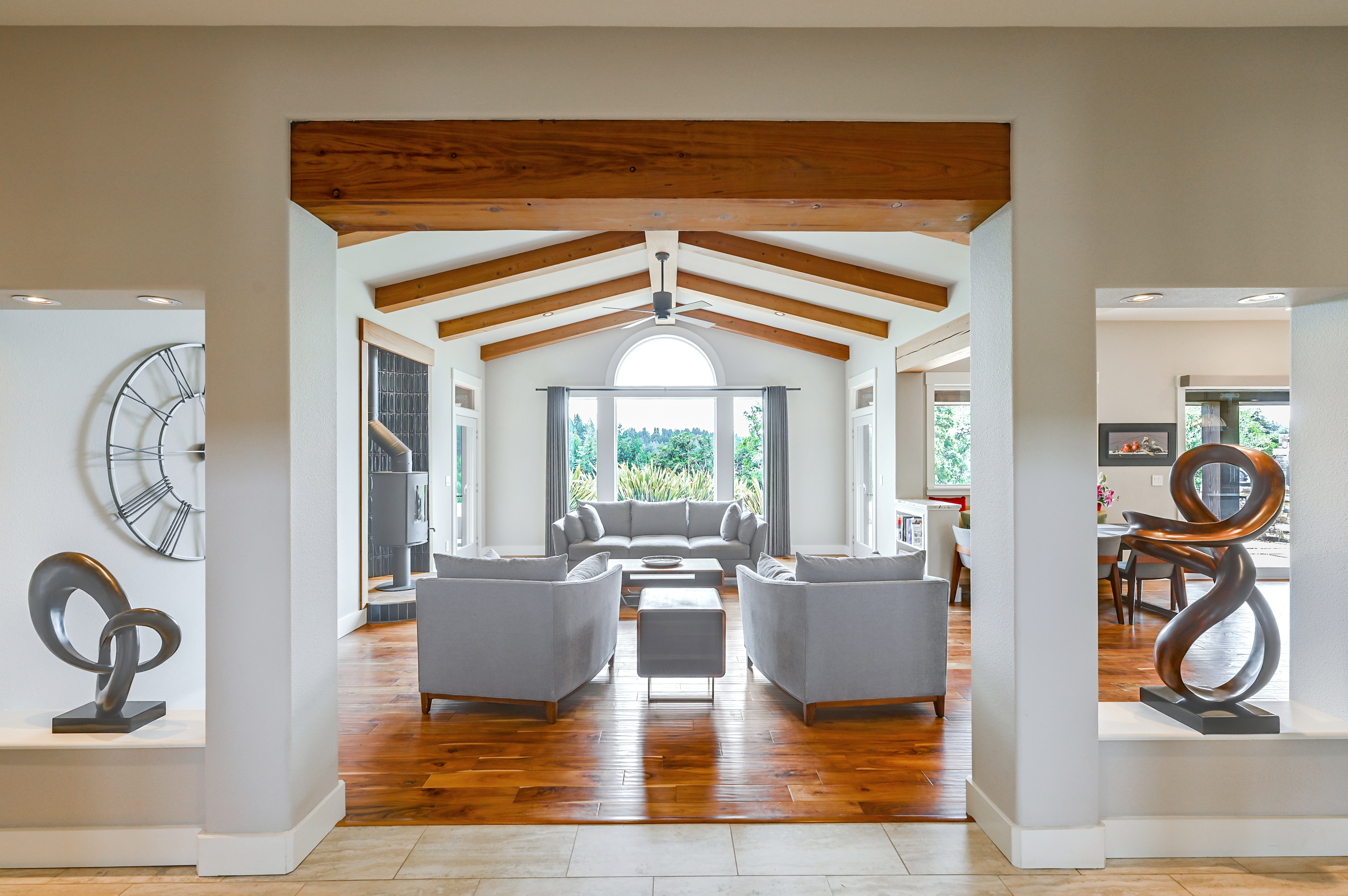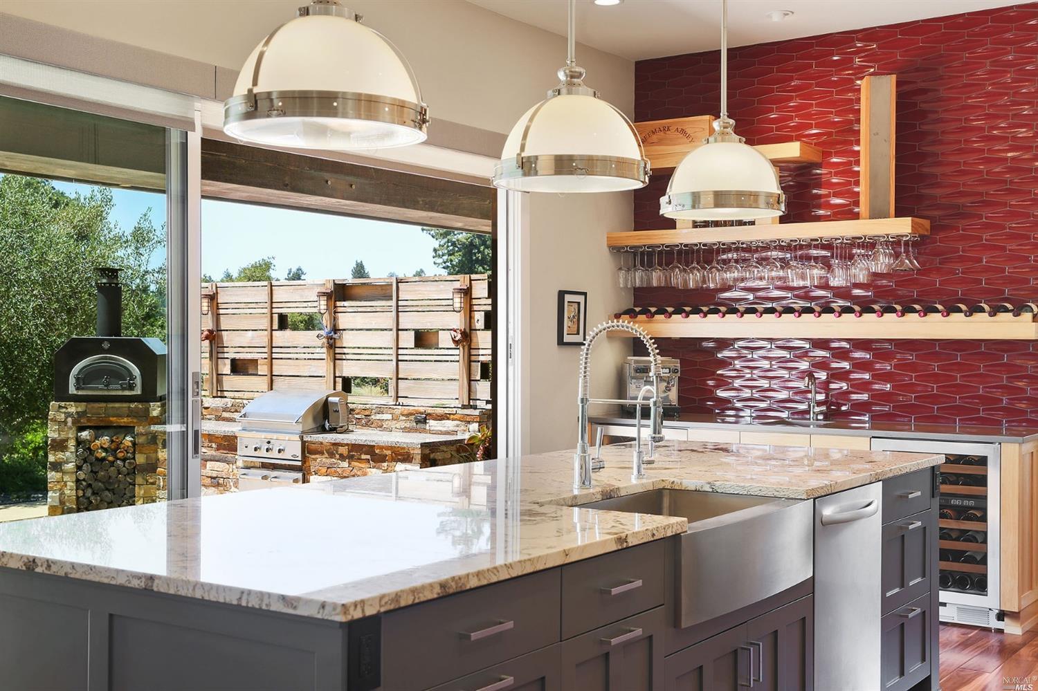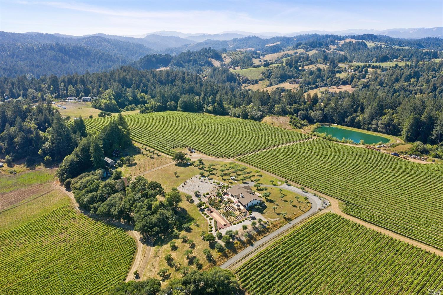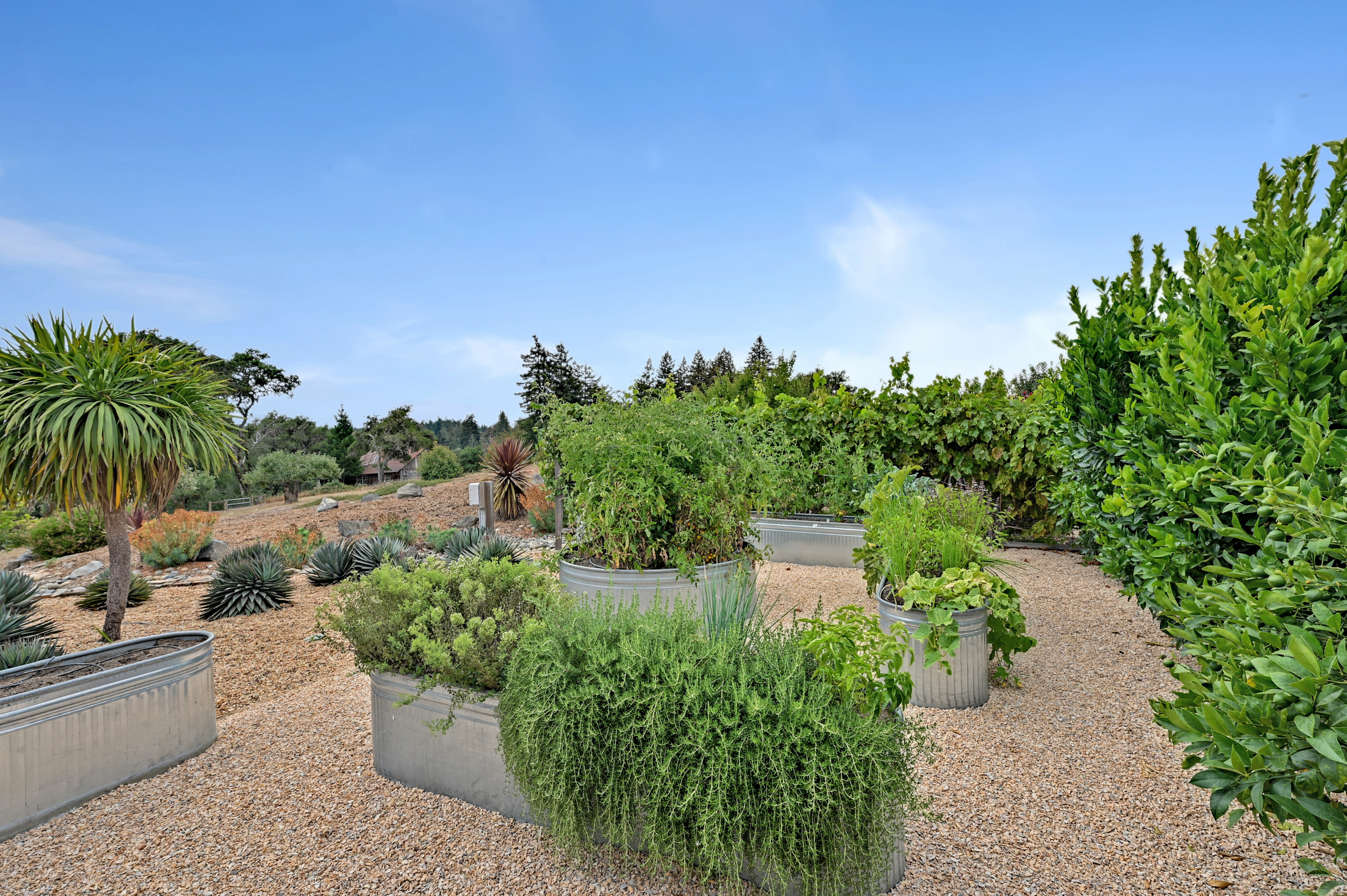 Sublime 4 + acre knoll top panoramic view estate. Impeccable interiors features include Heath tile, Swiss granite, Akdo marble, custom redwood beams, Artisan cabinetry, SubZero Fridge and Wolf range. Beautiful private and common rooms in an elegant, open floor plan with seamless interior/exterior flow. Expansive grounds with patios, stone walls, outdoor kitchen with pizza oven & grill, bocce, hot tub, vineyard views, artistic landscape & heirloom fruit trees.