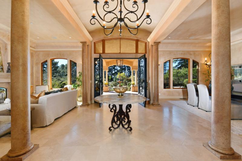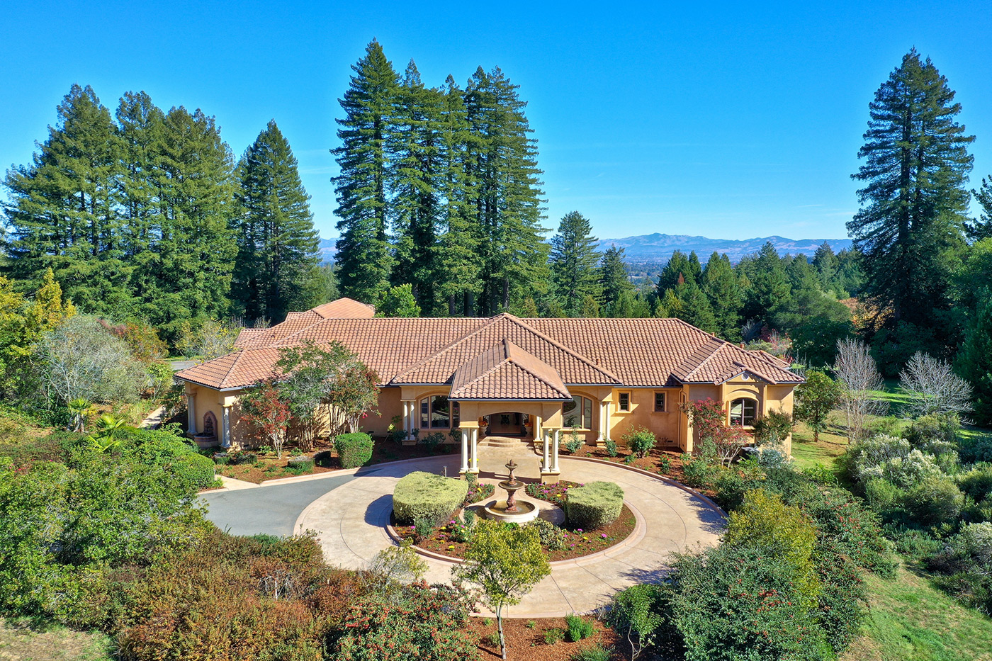 Santa Barbara Mediteranean estate in one of West Sonoma County's most coveted locations. Sited on 5.4 level, ridge top acres. is 6,300 square feet of unparalleled , single level living. The first of two impressive iron gates leads you to a covered portico and fountain. The quality of finishes and scale is immediately evident with materials including imported travertine, Venetian plaster, limestone and French granite. The entry intersects a flawless floor plan with Primary Suite wing featuring a magnificent library with fireplace, dedicated laundry and a 1,000 square foot Primary Bedroom with balcony, private gym, sitting room with fireplace and elegant spa-like bathroom. The opposite wing of the home consists of 3 generously sized bedrooms, two full baths and laundry room. In the heart of the home is a formal living and dining room with a 1,160 bottle wine room. A magnificent kitchen with the finest finishes and appliances opens to a large family room with beautiful views. The dedicated theatre inspired two Academy Awards for Avatar and Alice. A second gate leads to a 4 car garage and one bedroom guest house overlooking a majestic redwood grove. The grounds are peaceful and exquisite with covered loggias, pathways and gardens. Minutes to all Sonoma County has to offer.